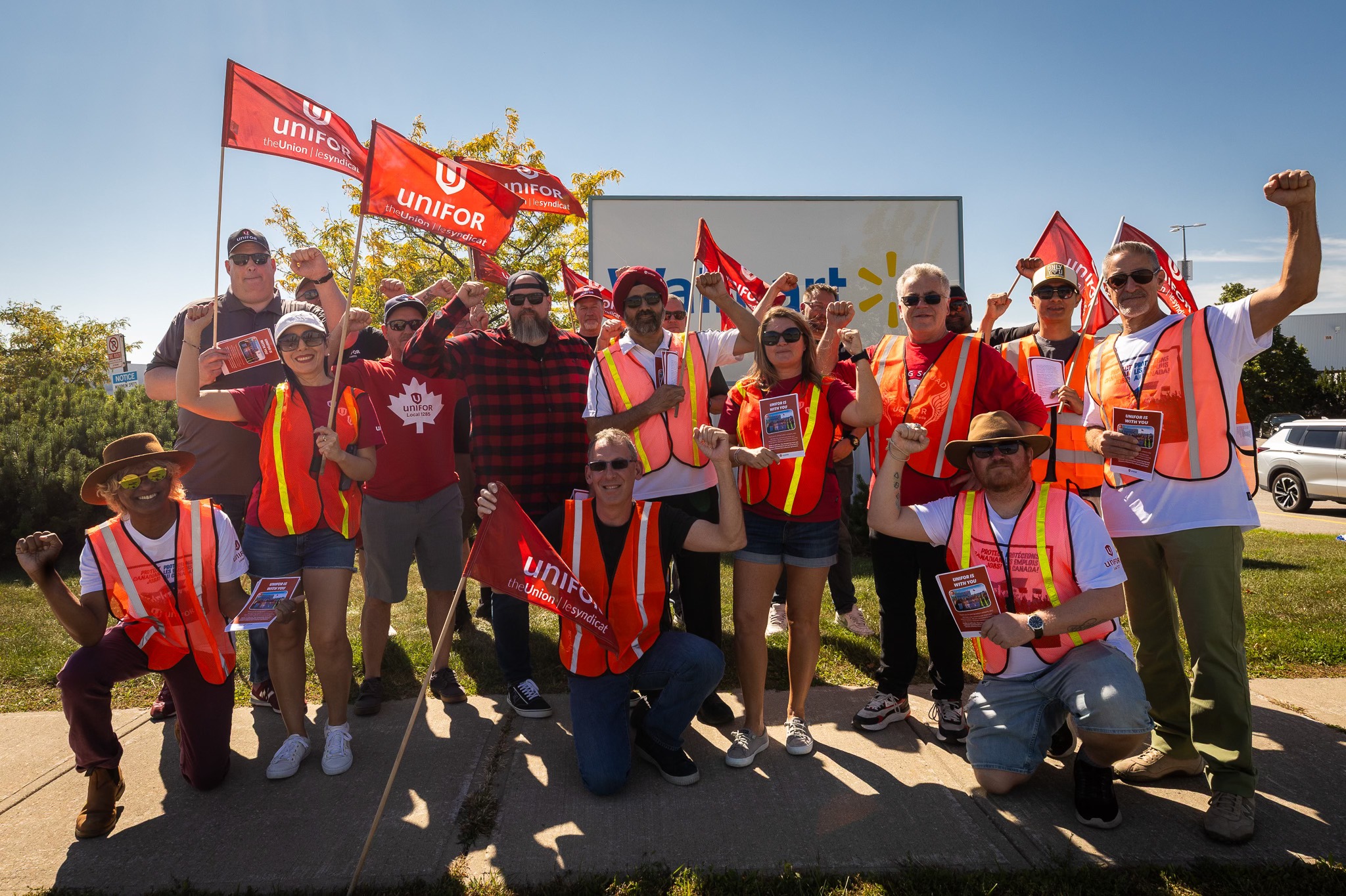 Unifor members rallied in solidarity with Walmart warehouse workers in Mississauga, ON on September 16, as they work towards achieving a historic first collective agreement.